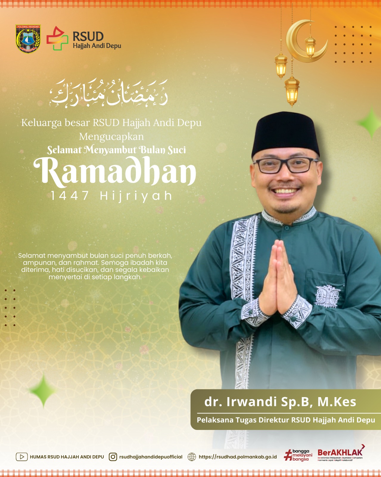 “Keluarga Besar RSUD Andi Depu mengucapkan Marhaban Ya Ramadhan 1447 H. Semoga bulan suci ini membawa keberkahan, kesehatan, dan memperkuat kebersamaan di tengah masyarakat,” ujar dr. Irwandi.