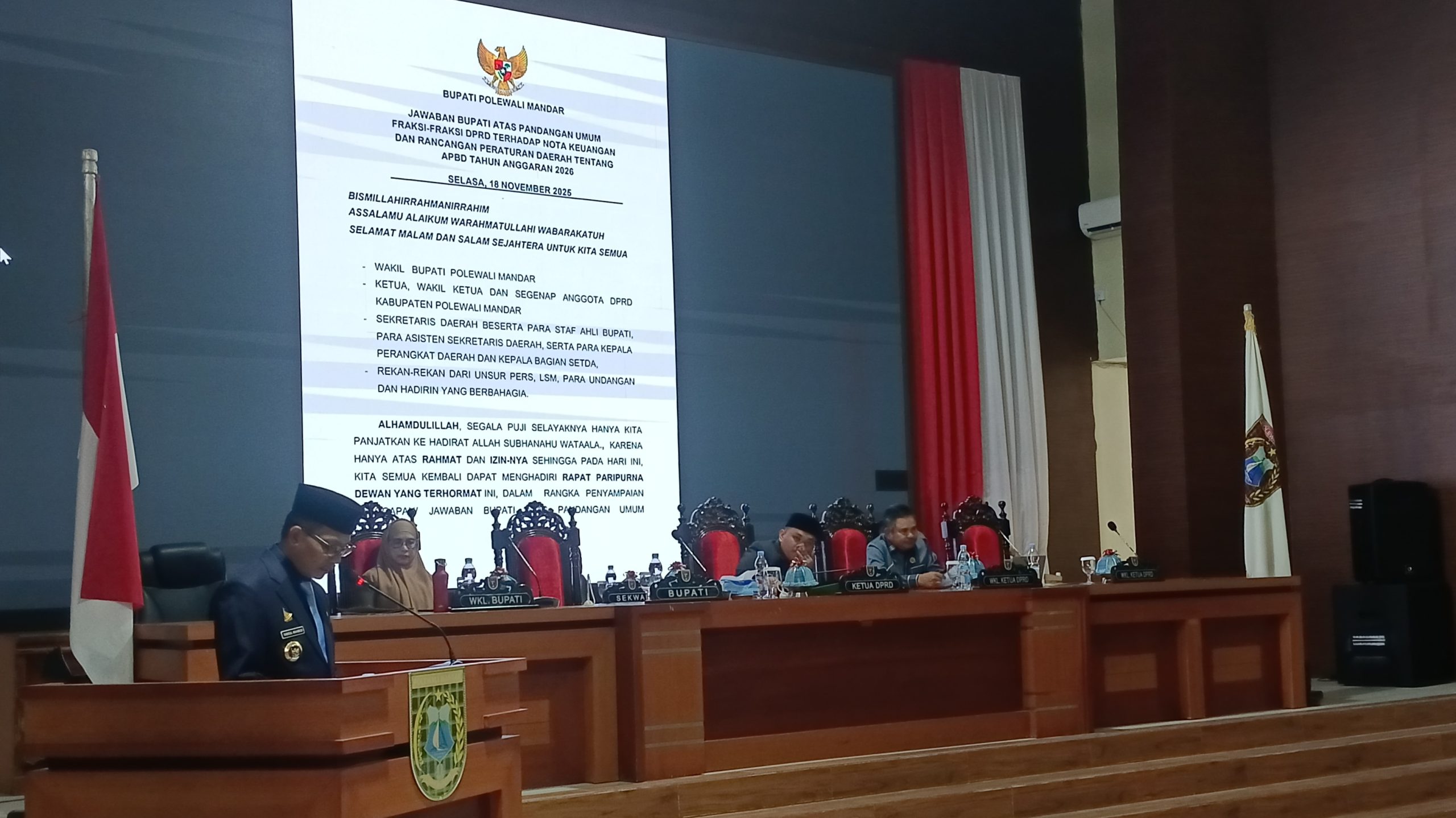 SulbarTa.com/Polman DPRD Kabupaten Polewali Mandar menggelar rapat paripurna dengan agenda penyampaian tanggapan dan jawaban Bupati atas pandangan umum fraksi-fraksi DPRD terkait Rancangan Peraturan Daerah (Ranperda) tentang APBD dan Nota Keuangan Tahun Anggaran 2026, Selasa malam (18/11/2025).