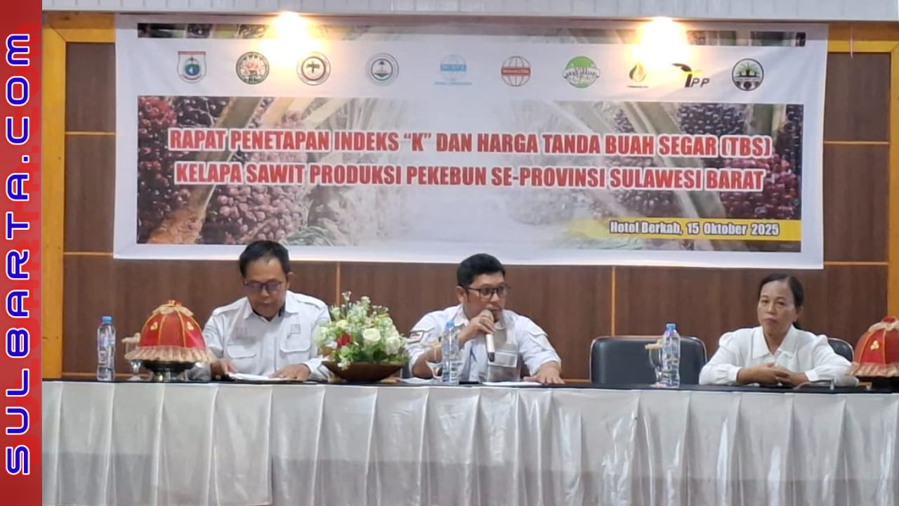 Mamuju-SulbarTa.com – Dinas Perkebunan Sulawesi Barat (Sulbar) melaksanakan Rapat Penetapan Indeks “K” dan Harga Tandan Buah Segar (TBS) Kelapa Sawit Produksi Pekebun Se-Sulbar Periode Oktober 2025, di Hotel Berkah, Jln. Soekarno Hatta Mamuju, Rabu 15 Oktober 2025.