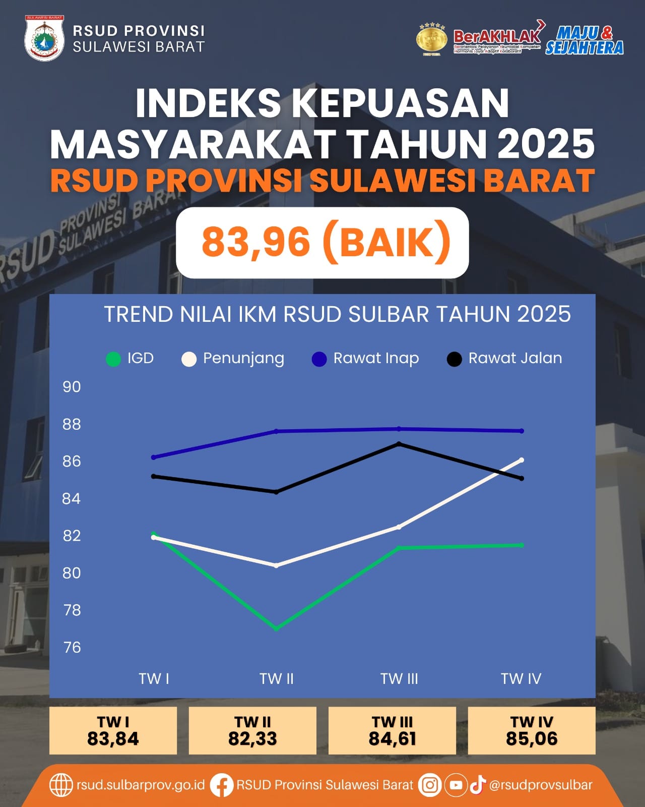 Mamuju-SulbarTa.com – RSUD Provinsi Sulawesi Barat mencatat capaian positif dalam hasil Survei Indeks Kepuasan Masyarakat (IKM) Tahun 2025 dengan nilai rata-rata sebesar 83,96 yang masuk dalam kategori Baik. Hasil ini mencerminkan tingkat kepuasan masyarakat terhadap kualitas pelayanan kesehatan yang diberikan oleh rumah sakit milik Pemerintah Provinsi Sulawesi Barat tersebut sepanjang tahun 2025.