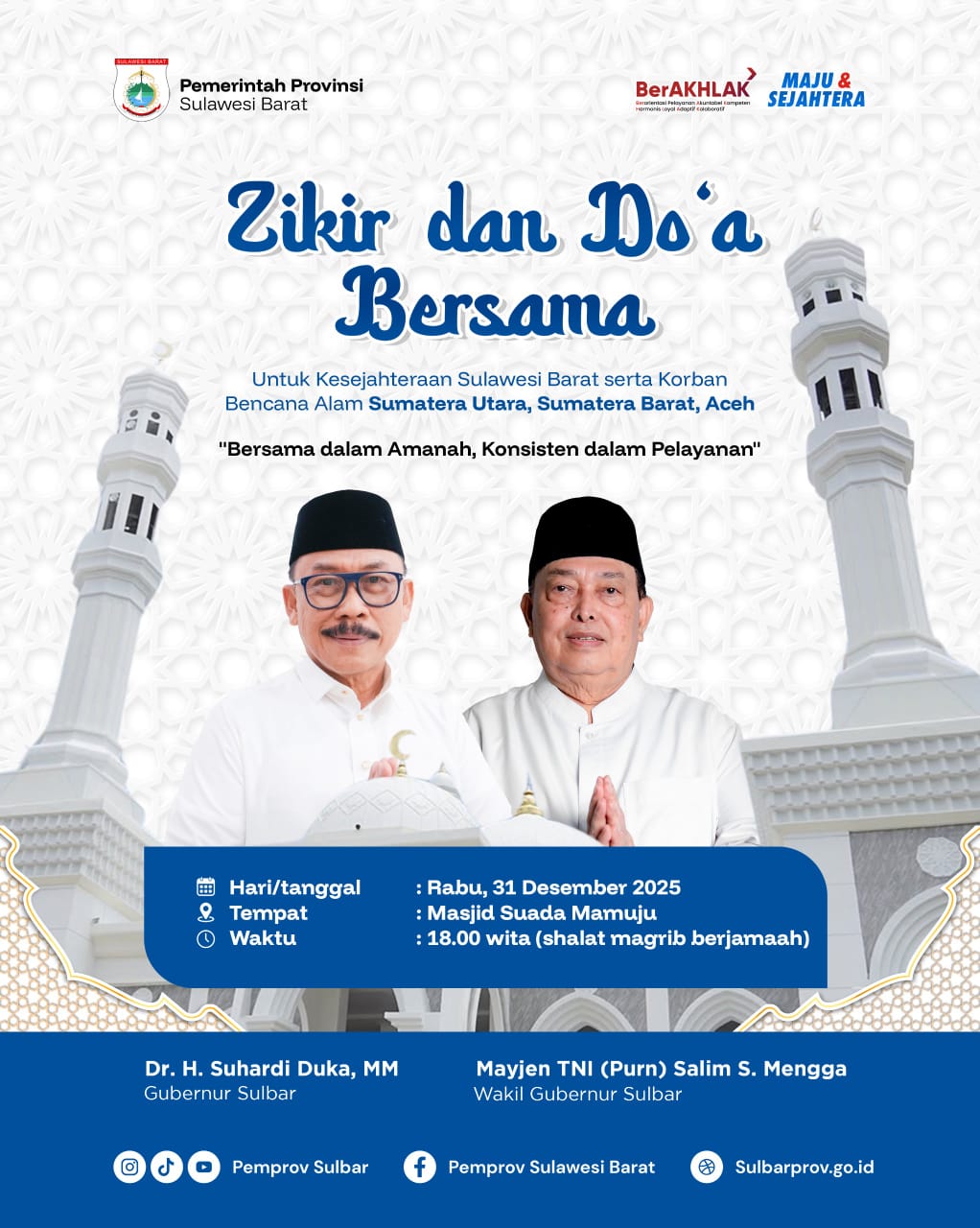 Zikir dan doa bersama tersebut akan dilaksanakan pada Rabu malam, 31 Desember 2025, bertempat di Masjid Raya Suada, Mamuju, dengan mengusung tema Bersama dalam Amanah, Konsisten dalam Pelayanan.