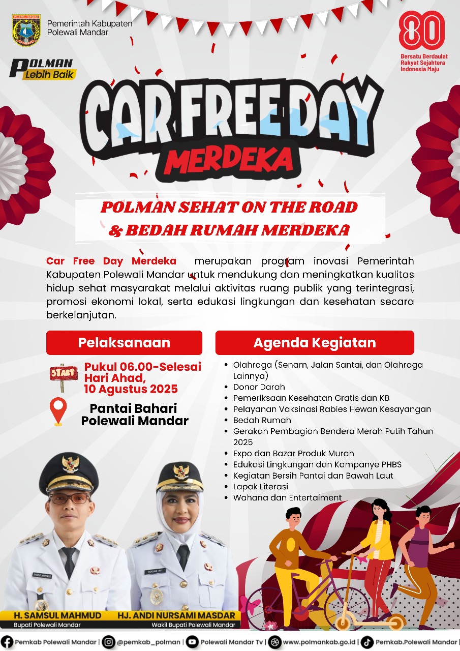 SulbarTa.com- Polewali Mandar – Dalam rangka memperingati Hari Kemerdekaan RI ke-80, Pemerintah Kabupaten Polewali Mandar menggelar program inovasi daerah bertajuk “Car Free Day Merdeka, Polman Sehat On The Road”. Kegiatan ini digagas langsung oleh Bupati Polewali Mandar, H. Samsul Mahmud, dan dilaksanakan di sepanjang Pantai Bahari Polewali dengan rute sejauh sekitar 1,5 kilometer.